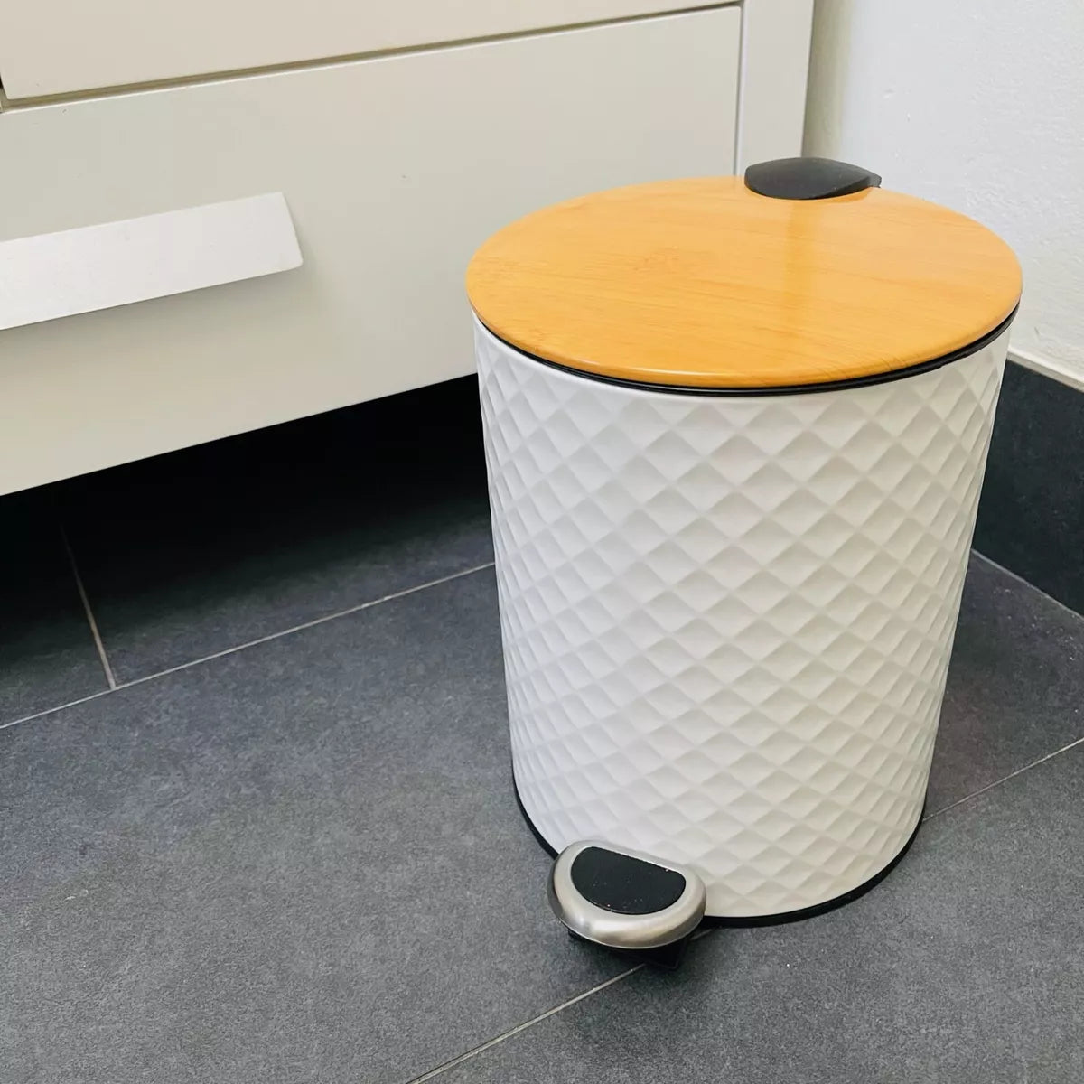 Cesto texturado blanco con tapa de madera y cierre suave 5 litros