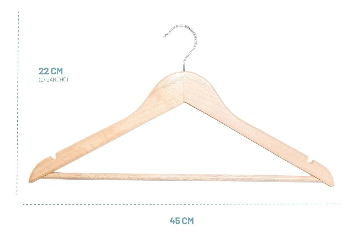 - Medidas: 45 cm de ancho x 22 cm de alto - Material: Madera rígida lustrada y laqueada para mayor durabilidad y un acabado sofisticado. - Gancho: Acero metálico giratorio, resistente y práctico. - Uso: Ideal para camisas, blusas, vestidos, pantalones y todo tipo de prendas que necesites organizar en tu placard.